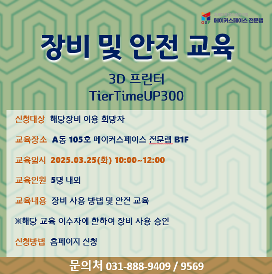 - 해당 교육 이수 대상자에 한하여 3D프린터 (TierTime UP300) 사용 승인을 해드립니다.