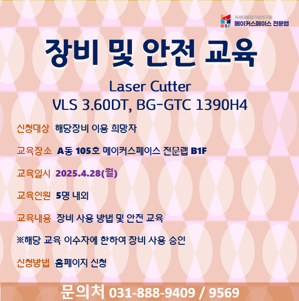 - 해당 교육 이수 대상자에 한하여  레이져 커터(VLS 3.60DT, BG-GTC 1390H4) 사용 승인을 해드립니다.