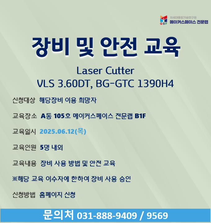 - 해당 교육 이수 대상자에 한하여  레이져 커터(VLS 3.60DT, BG-GTC 1390H4) 사용 승인을 해드립니다.