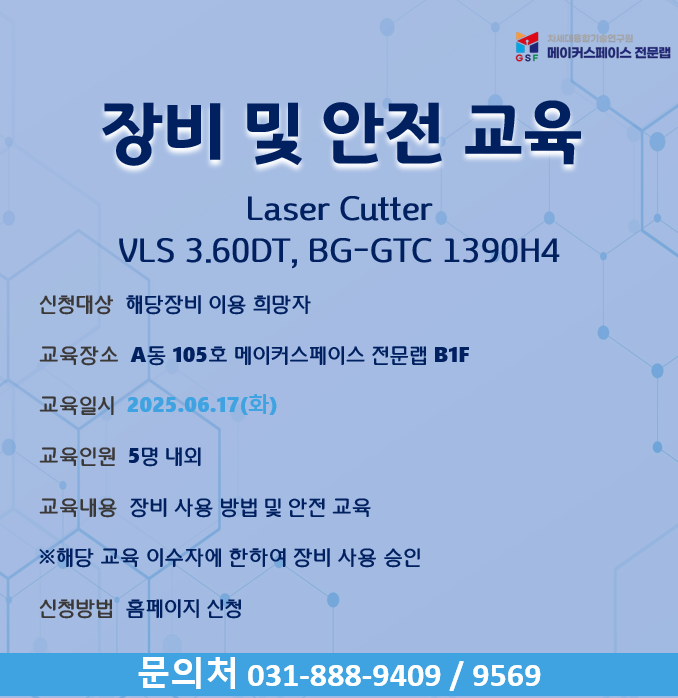 - 해당 교육 이수 대상자에 한하여  레이져 커터(VLS 3.60DT, BG-GTC 1390H4) 사용 승인을 해드립니다.