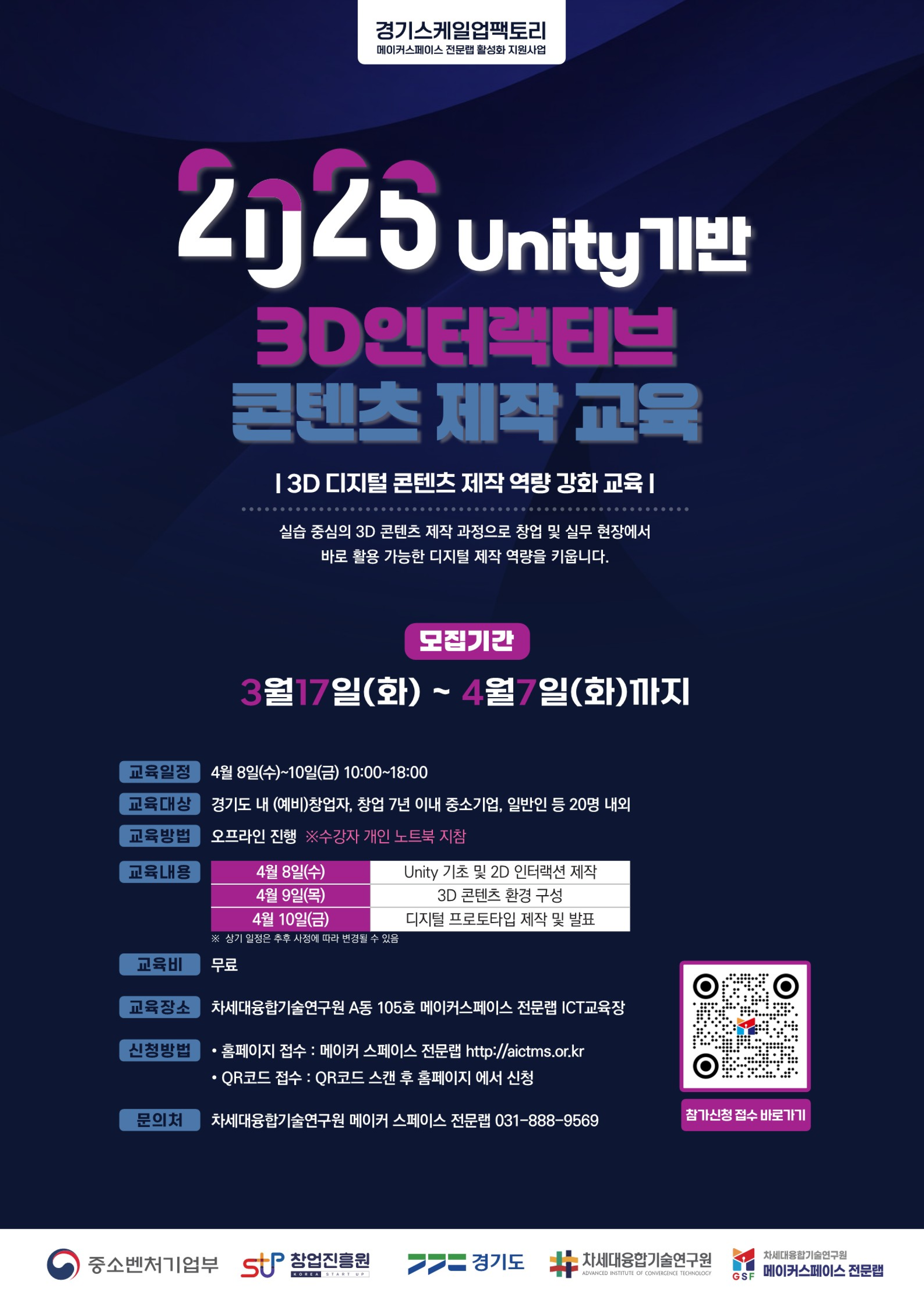 · 4월 8일 | Unity 기초 및 2D인터랙션 제작 → 3D 화면을 만들기 위한 기본 프로그램 사용 방법과 간단한 버튼·클릭 기능을 배우고 · 4월 9일 | 3D 콘텐츠 환경 구성 → 3D 공간과 환경을 구성해 실제 콘텐츠처럼 화면을 만드는 방법을 익히며 · 4월 10일 |디지털 프로토타입 제작 및 발표 → 만든 콘텐츠를 하나의 디지털 프로토타입으로 완성합니다.